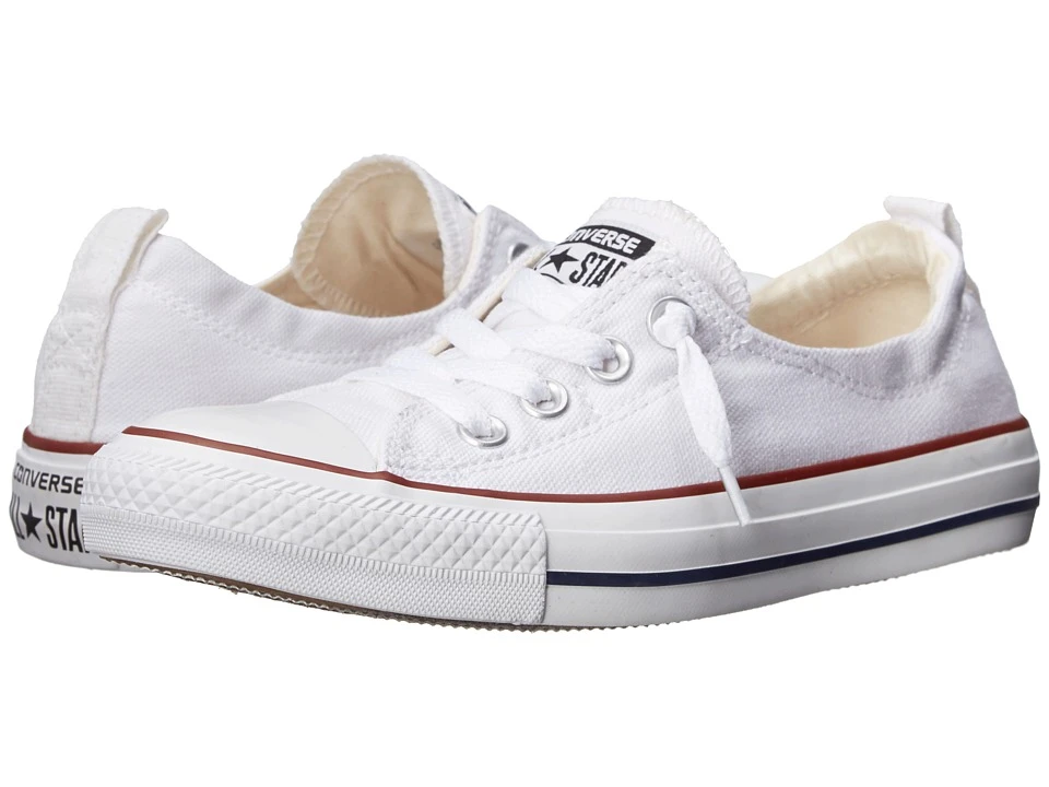 From the coastline to the promenade, give your style a spring-time vibe with the Chuck Taylor All Star Shoreline slip-ons from Converse! ; Please note: The size on the bottom of the shoe is the UK size. Please refer to the inside tongue label for the U. S. size. Canvas uppers. Unlined with a cushioned insole for all-day comfort. Slip-on construction with removable laces for a personalized look. Elastic collar with heel pull tab for a close, comfy fit. Signature Chuck Taylor All Star rubber toe box, textured toe bumper, contrast sidewall trim, medial-side air vent portholes and All Star heel patch. Rubber midsole. Classic Converse diamond-pattern rubber outsole. Imported. Measurements: ; Weight: 13 oz ; Product measurements were taken using size 8, width B – Medium. Please note that measurements may vary by size.