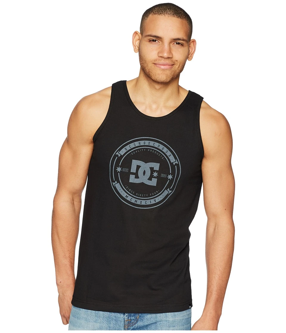 Get a leg up on the competition in the DC Unfair Tank Top. Standard-fit tank top in a soft jersey knit. Sticker logo graphic print across the chest. Solid binding at the collar and arms. Sleeveless. Straight hem with locker tag at the left hip. Solid: 100% cotton; Heather: 90% cotton 10% polyester. Machine wash tumble dry. Imported. Measurements: Length: 30 in Chest Measurement: 40 1 2 in Product measurements were taken using size MD. Please note that measurements may vary by size.