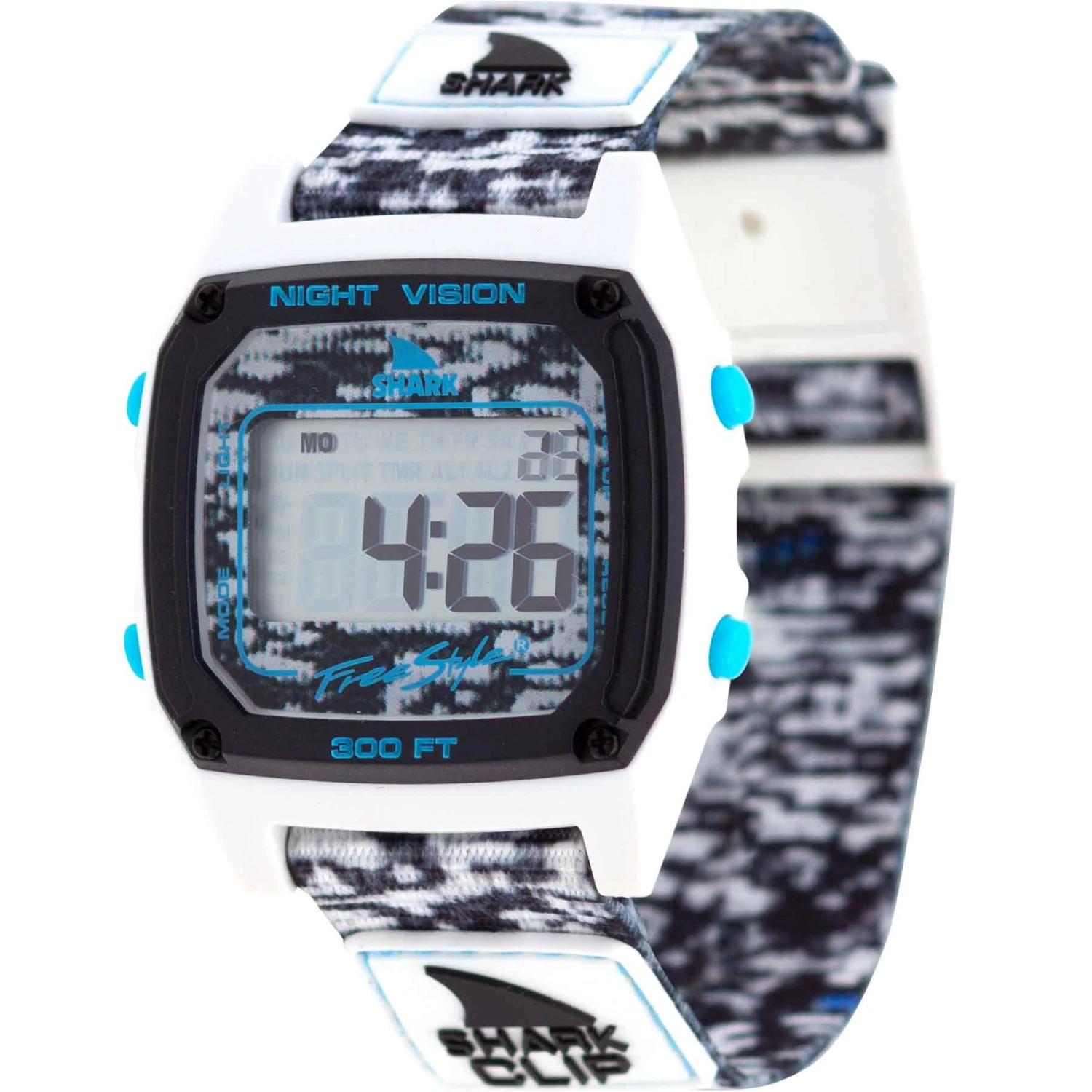 S T Y L E#: Fs101084 Electrifying like catching your first wave, this latest addition to the Shark Clip collection gives your wrist a jolt of energy fueled by color and functionality. The Shark Clip is the original band system that ignited the Freestyle brand. Much like a seatbelt, just clip it in to keep your watch safe, snug and comfortable. The Shark Clip comes loaded with standard digital features like time, date, stopwatch, countdown timer, alarm and night vision backlight. Like all Shark Watches it is built to go with you on all your adventures in and out of the water. Water resistant to 100 Meters and backed by our limited lifetime warranty. / Watch Shark Clip White Shockwave / Freestyle