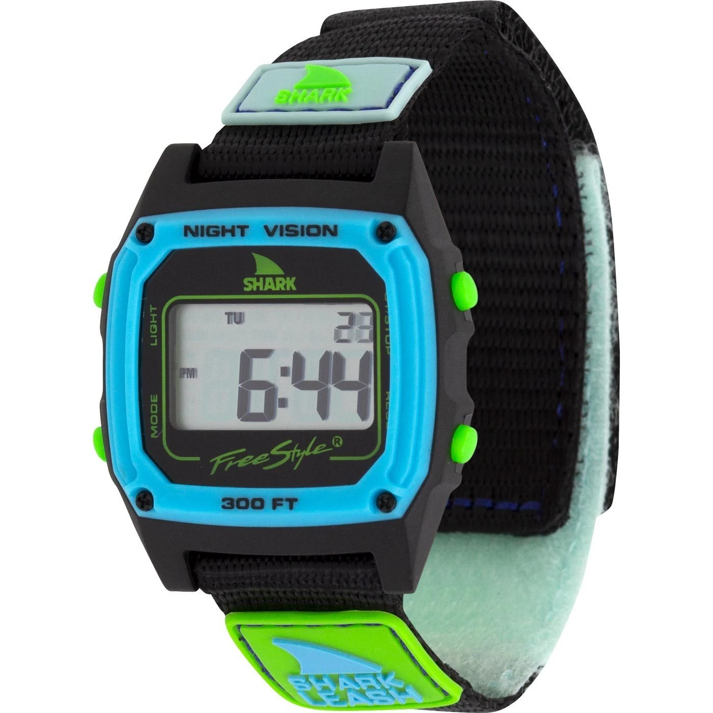 The original Velcro band that ignited Freestyle Watches in the late 80’s is back and better than ever. The shark leash’s velcro closure system is modeled after an 80’s style surfboard leash, and is ready to get radical. The Shark Leash comes loaded with standard digital features like time, date, stopwatch, countdown timer, alarm and night vision backlight. Like all Freestyle Watches, The Shark Leash is water resistant to 100 Meters and backed by our limited lifetime warranty. Shark to the Future! Style#: Fs101061 / Watch Shark Leash Happy Accident in Multi / Freestyle