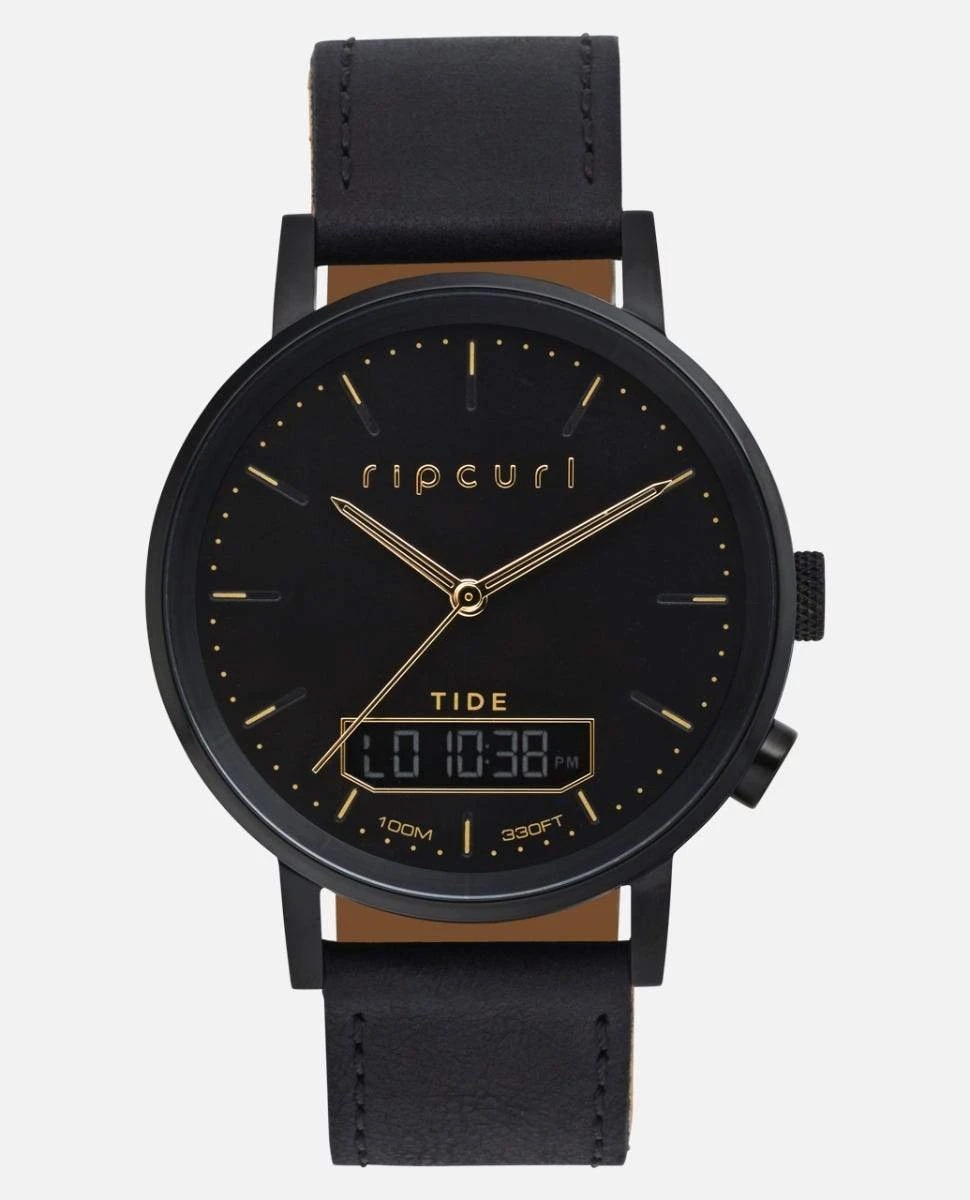 Tide meets style with our Circa Digital Tide watch. We’re always on The Search, so we know time and tide is everything and with this jeweled tide movement watch with dual time, date, seconds and a light for night, you’ll always know. This stunning piece was constructed with clean lines and a classic vintage look in a 42mm stainless steel case. The Circa utilizes distinctive case finishes and a lightly distressed leather band to create it’s striking look. / Watch Circa Tide Digital Leather in Midnight (4029) / Rip Curl