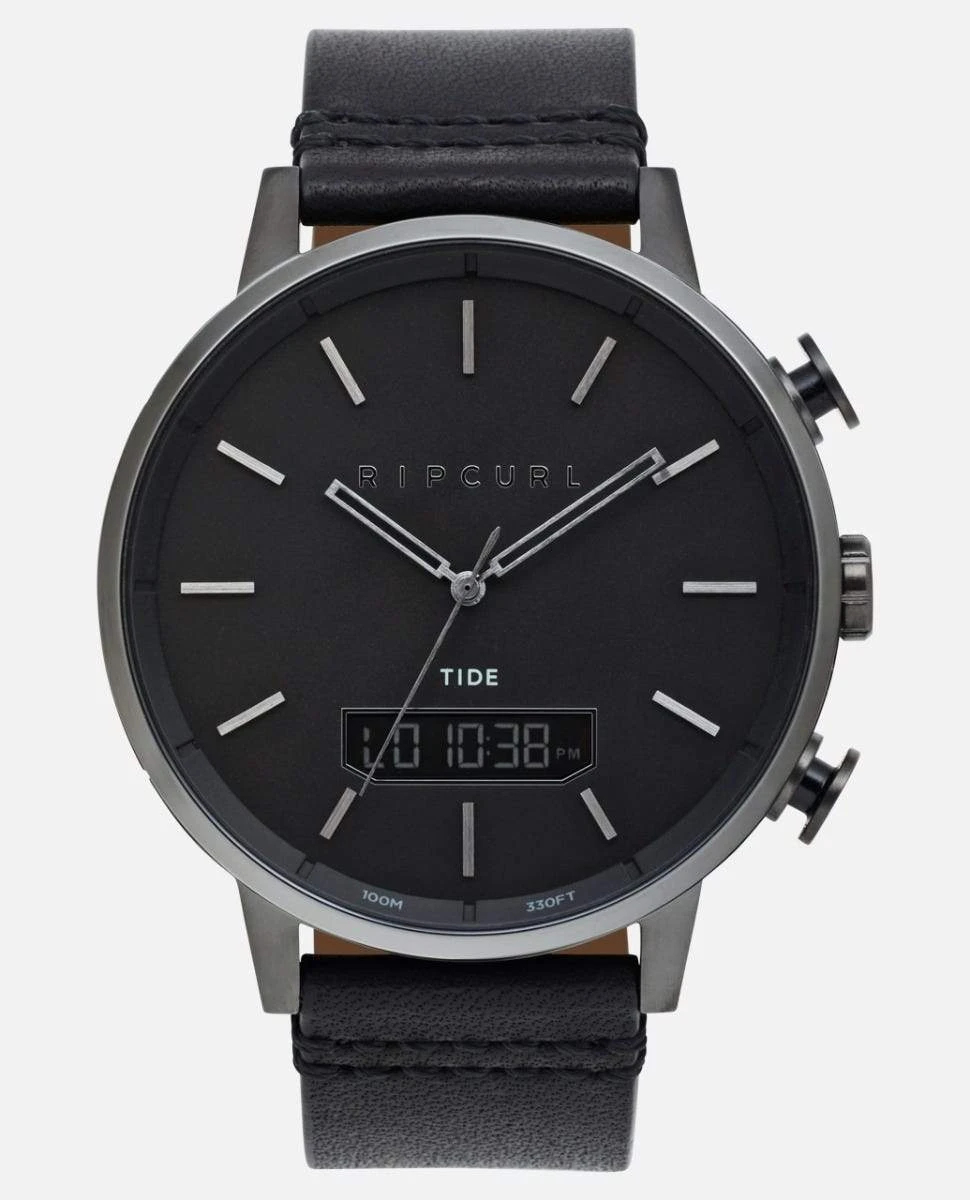 Time and Tide is everything, and with this jeweled tide movement with dual time, date, seconds and a light for when it’s dark, you’ll always know. This industrial design features a unique open link strap, or a genuine leather strap, custom high index markers and an asphalt dial. / Watch Detroit Tide Digital in Gunmetal / Rip Curl