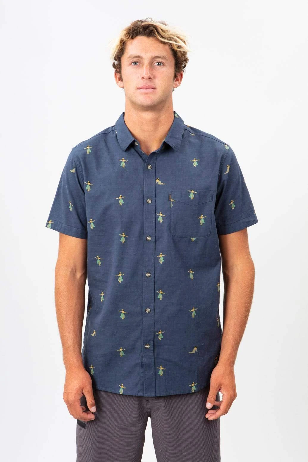 Tropical prints give off good vibes for every occasion, and our Hula Breach Short Sleeve Shirt is here for the party. This button up was designed with an all-over hula print and front chest pocket. Pair with denim for casual outings, or your go-to pants for more formal wear. Stretch cotton Standard fit All over hula print Woven flag label on pocket Garment wash with softener / Mens Woven Hula Breach in Navy Blue / Medium / Cotton / Rip Curl
