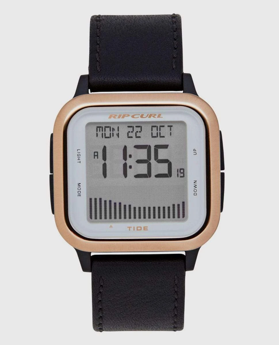 Surf, Sport, Style; a new tide watch for the next generation. Next Tide features 500 pre-programmed global tide locations with precise tide height graph, next tide time, direction and future forecasting plus Spot X. With a scratch resistant mineral crystal lens housed in a solid stainless steel bezel with a durable yet lightweight ergonomically rounded polycarbonate case, Next Tide is both comfortable and tough. / Watch Next Tide in Gold / Rip Curl