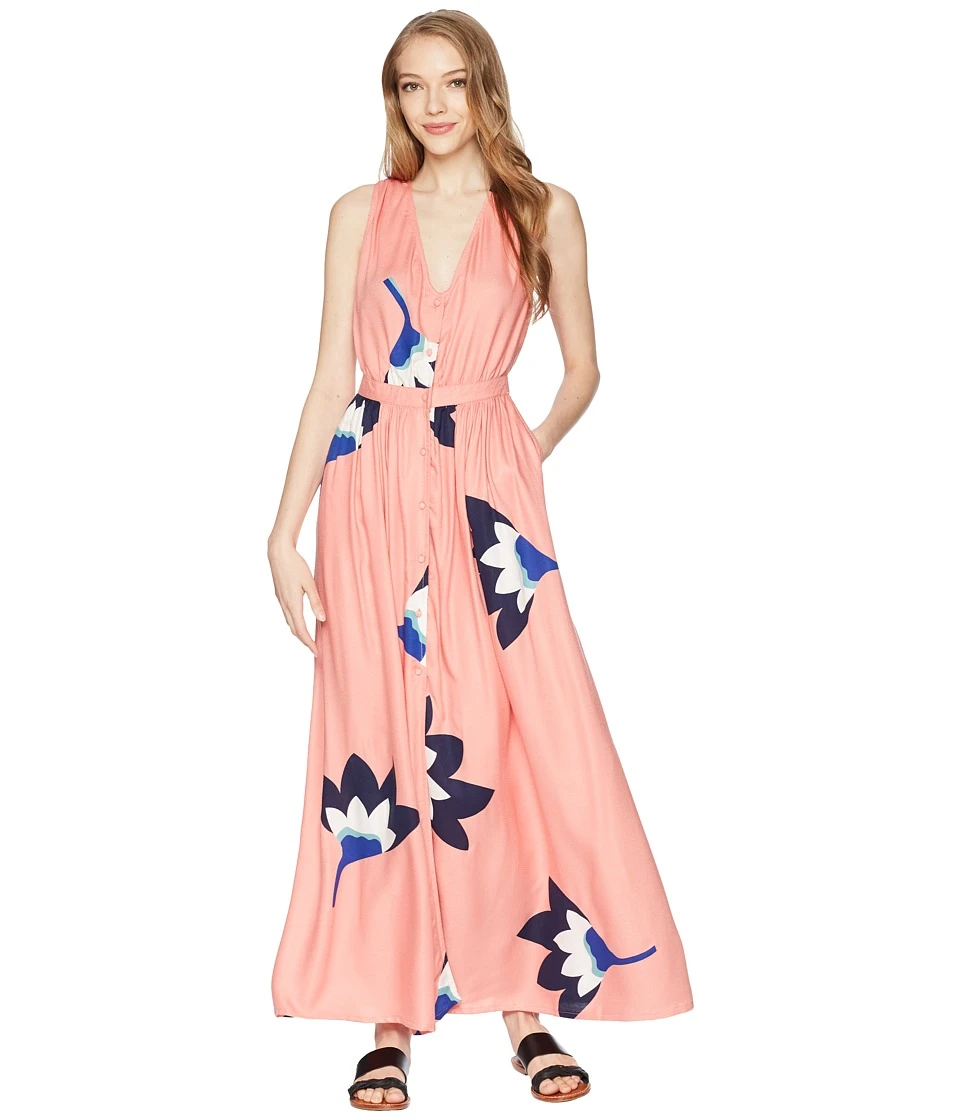 Make a defining statement with the alluring style of the Roxy Apache Nature dress! Woven maxi dress in a flowing silhouette. Classic comfortable regular fit. Bold print detaling adds a stylish retro appeal. V-neckline. Sleeveless design. Stacked button closure at front. Finished with Italian pockets. Straight hemline at a sweeping length. 100% viscose. Dry clean only. Imported. Measurements: Length: 56 in Product measurements were taken using size SM (US 3-5). Please note that measurements may vary by size.