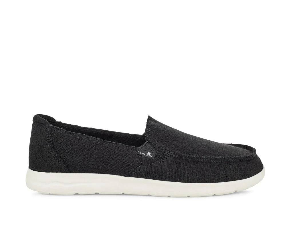This modernized Sidewalk Surfer is built on a high-rebound, lightweight and ultra cushy sole guaranteed to enhance your daily vertical experience. Extreme Comfort Warning: Donna Lite may lead to irreversible perma-smiles and euphoric feet feels. Linen blend slubby canvas upper Exposed gore, Moc-toe Detail ing, Frayed edges100% Cotton canvas lining Yoga Mat drop in comfort sockliner lined with textile I M E V A outsole100% Grs Certified Rpet Sanuk Flag Woven Label Sustainability Initiative(s): Vegan / Womens Shoes Donna Lite Tx in Black / 6 / 100% Cotton / Sanuk